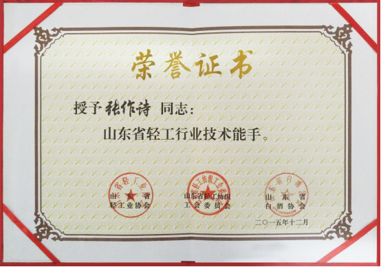 2015年12月18日-20日,山東省首屆“技能興魯”職業(yè)技能大賽暨山東省白酒首屆釀酒職業(yè)技能大賽隆重舉行。心心酒業(yè)有限公司糧食酒車間釀酒師張作詩參加比賽,被授予“山東省輕工行業(yè)技術(shù)能手”榮譽稱號。“這不是我個人榮譽,是企業(yè)榮譽,是各位領(lǐng)導(dǎo)對我的大力支持和企業(yè)對我的培養(yǎng)所取得的,所以,我要感謝廠領(lǐng)導(dǎo)給我這一個平臺。通過這次技能大賽所取得的經(jīng)驗,要運用到生產(chǎn)實際中區(qū),要抓好質(zhì)量關(guān),要提高員工的思想素質(zhì),要提高員工的技能水平,團結(jié)上下一致,建立一個技能團隊,為企業(yè)發(fā)展,再創(chuàng)佳績。”張作詩說道。